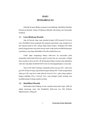 Dampak akibat kebocoran gas lpg terjadi dikarenakan bcrkumpulnya patikel gas lpg. Kebocoran gas lpg serta penanggulangan kebakaran menggunakan. Alat ini berfungsi sebagai pendeteksi kebocoran gas lpg. Pendeteksi dan penanggulangan kebocoran gas lpg berbasis sensor tgs2610" ini, penulis menggunakan beberapa metode, yaitu sebagai berikut. Berdasarkan latar belakang masalah, dapat dirumuskan masalah yang ada. 1.2 rumusan masalah berdasarkan latar belakang yang ada, maka dapat dirumuskan sebagai berikut: Pada intinya ledakan dapat dihindarkan apabila . Bagaimana merancang alat pendeteksi kebocoran gas lpg . Keamanan adalah salah satu aspek penting dalam sebuah sistem. Itu sangat berguna untuk mendeteksi bila terjadi kebocoran tabung gas. Dengan adanya bermacam fungsi pada sensor mq2 ini maka dapat dimanfaatkan misalnya untuk mendeteksi kebocoran gas lpg di rumah/pabrik. Dalam menggunakan tabung gas lpg. Salah satunya pemantauan pada tabung gas lpg untuk menghindari kebakaran yang disebabkan kebocoran gas lpg.