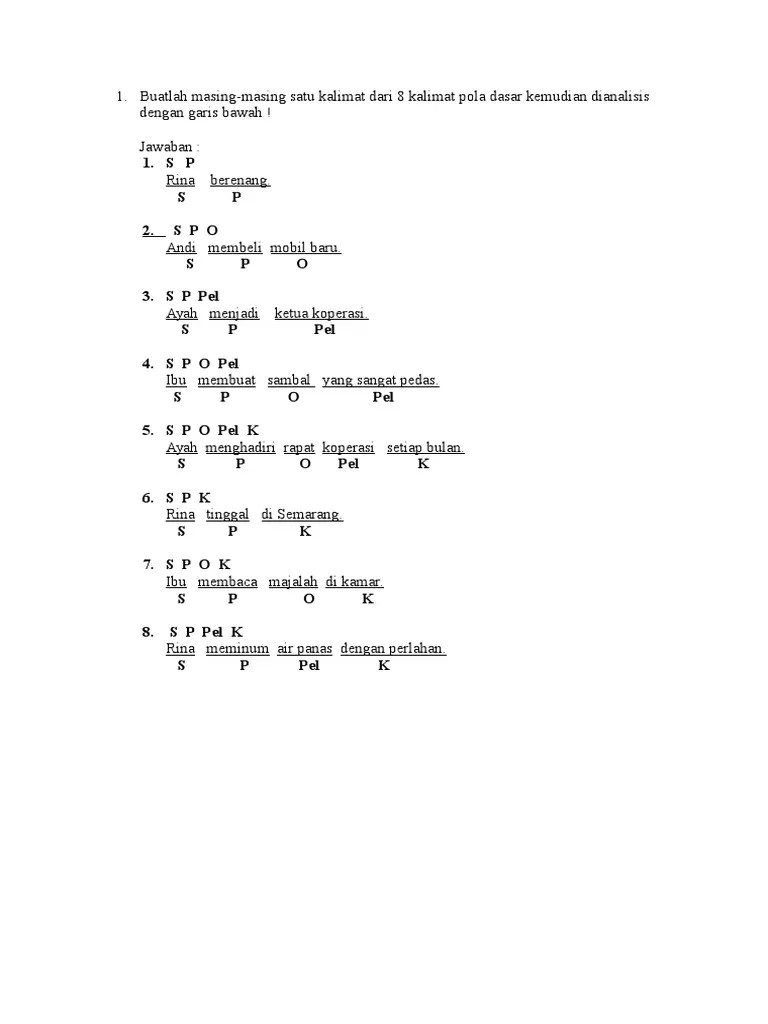 Kalimat berpelengkap memiliki pola dasar s p pel (subjek predikat pelengkap) dan s p o pel (subjek predikat objek pelengkap). Contoh kalimat yang tidak berpredikat. Dalam tata bahasa indonesia terdapat . Tuti tiba yang paling terakhir dengan sangat lambat. Kartini sedang membuat surat lamaran kerja. Sulaiman mengajari anaknya melukis bunga mawar. 3.2 kalimat dasar berpola s p o; Contoh kalimat berpola spo tersebut tentunya dapat dipahami setelah anda mengetahui bentuk kalimat efektif. 3.4 kalimat dasar berpola s p o pel. 3.1 kalimat dasar berpola s p; Contoh kalimat simpleks yaitu : Perhatikan kedua contoh kalimat berikut ini.